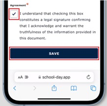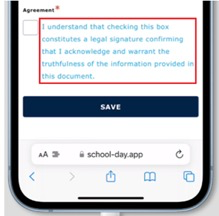 If using our responsive site https://school-day.app [https://school-day.app/#!/] , click or tap the box to confirm you have read and understand the Payors (School Board) Pre-Authorized Debit (PAD) Agreement and click or tap Save to add your banking information to your profile.