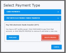 9) If you need to change your profile for any reason in the future, after you have clicked on the Checkout button from your Cart, then click on Pay With Electronic Funds Transfer, and click on Delete Profile. You may then follow the steps above to create a new profile.