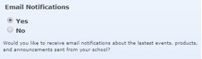 • Select Yes to receive email notifications about the latest Events, Products, Services, and Announcements sent from your school. Please note, you will only receive emails for items if the creator has opted to send emails upon creation of those items.