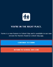 2) Click Continue To Forms. You will be redirected to school-day.app [https://school-day.app/#!/login] , which is our responsive parent site, without being prompted to log into your account.